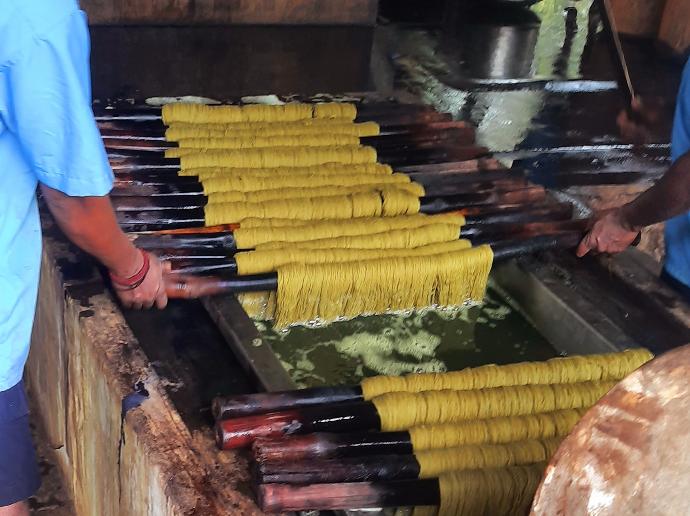 Specialised in natural indigo, we have mastered a full range of lightfast colours including yellow (e.g. Marigold flower) and red (Rubia cordifolia & others). Traditional Indian dyers used myrobalan, alum, wood ash and dye extracts and we build on this knowledge. We don’t use chromium or synthetic alizarin. For indigo, we don’t use hydrosulphite, a hazardous pollutant.