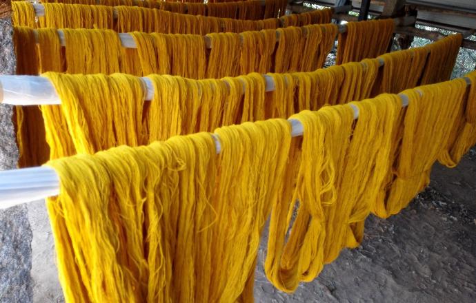 This pretty flower produces yellow, and other colours when mixed. Dried flowers are ground into a powder and added to a pot for simmering, after which straining gives the dye. It is easily available & relatively easy to use!